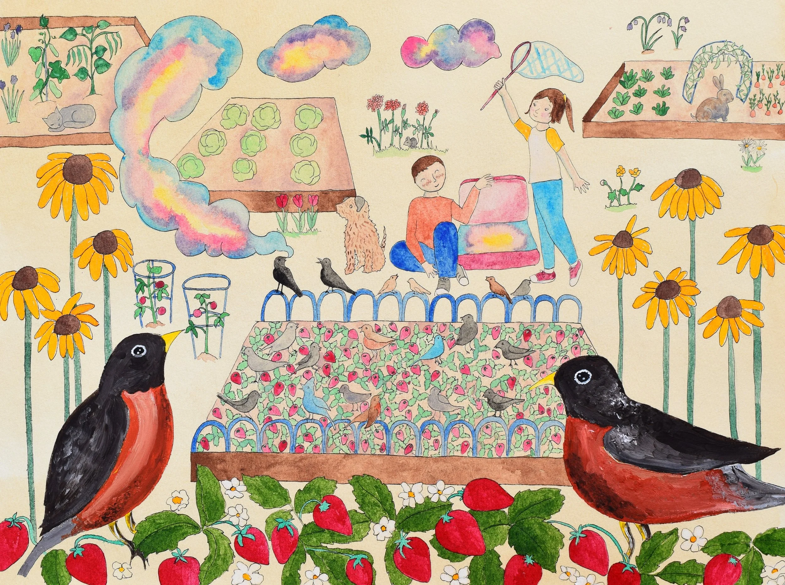 Alex, Minerva and Pip Catch Songs in the Garden (Gouache, acrylic and tea, 2022)